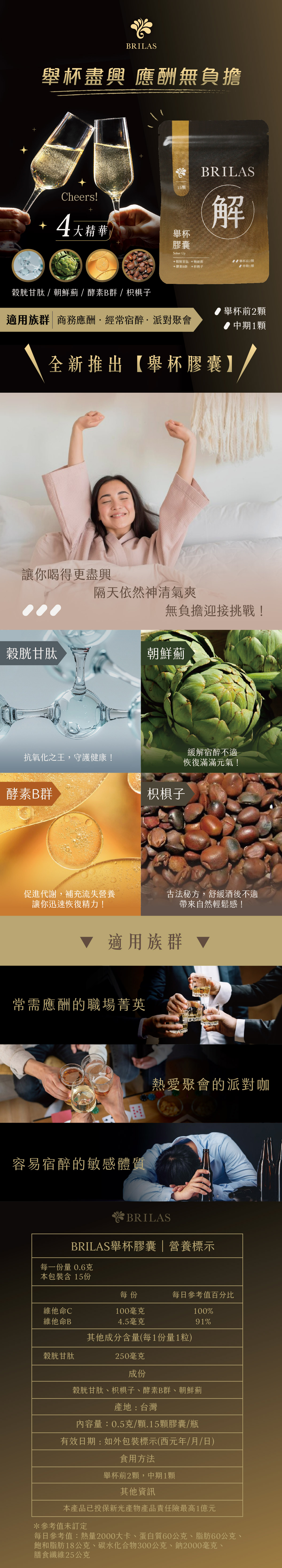 舉杯盡興,應酬無負擔。 穀胱甘肽號稱-- 抗氧化小鋼炮, 朝鮮薊給肝臟 VIP 通道, 枳椇子是老祖宗的派對秘方, 酵素B群補回流失能量。 客戶應酬、生日派對、 演唱會開趴, 只要 2+2 顆節奏